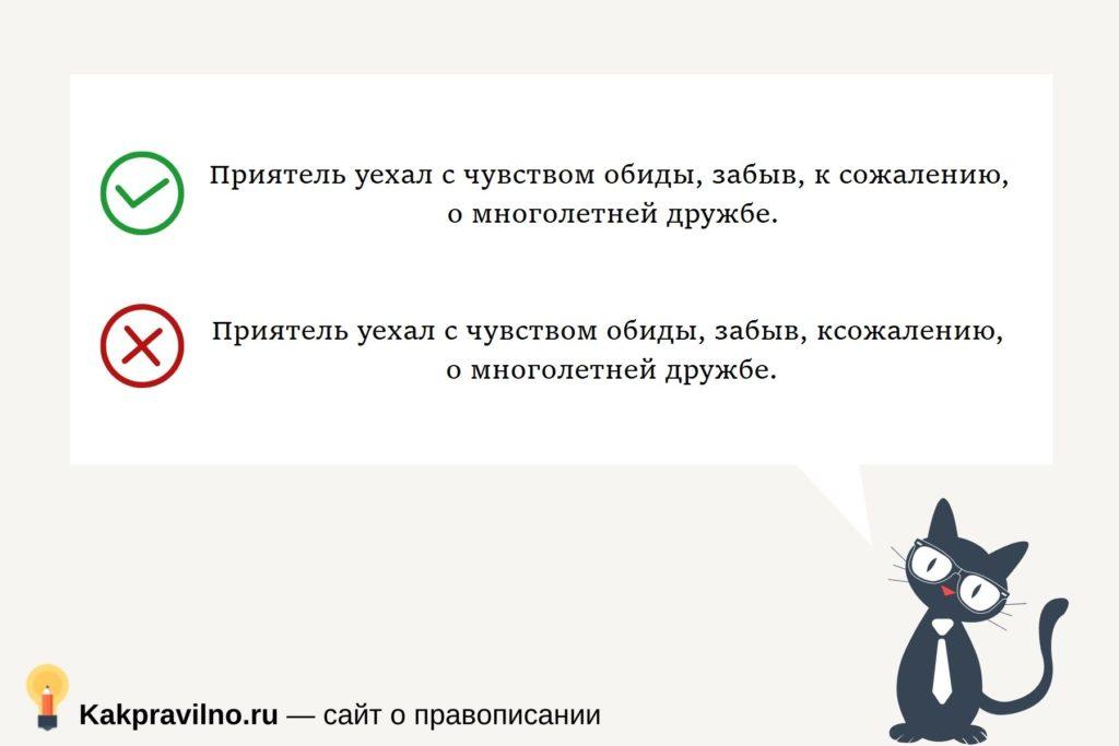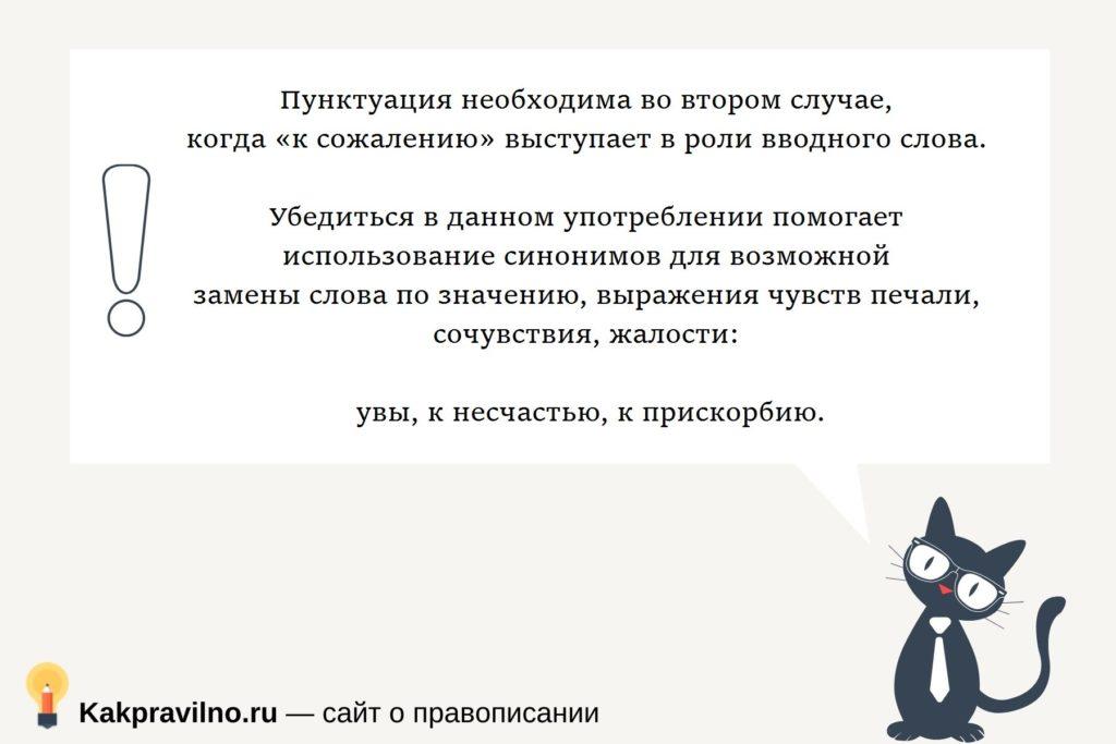 Второй способ проверки – нужно убрать слово «к сожалению» из предложения. Если смысл сохраняется, значит, конструкция является вводной, а знаки препинания ставятся с учетом ее места нахождения.
