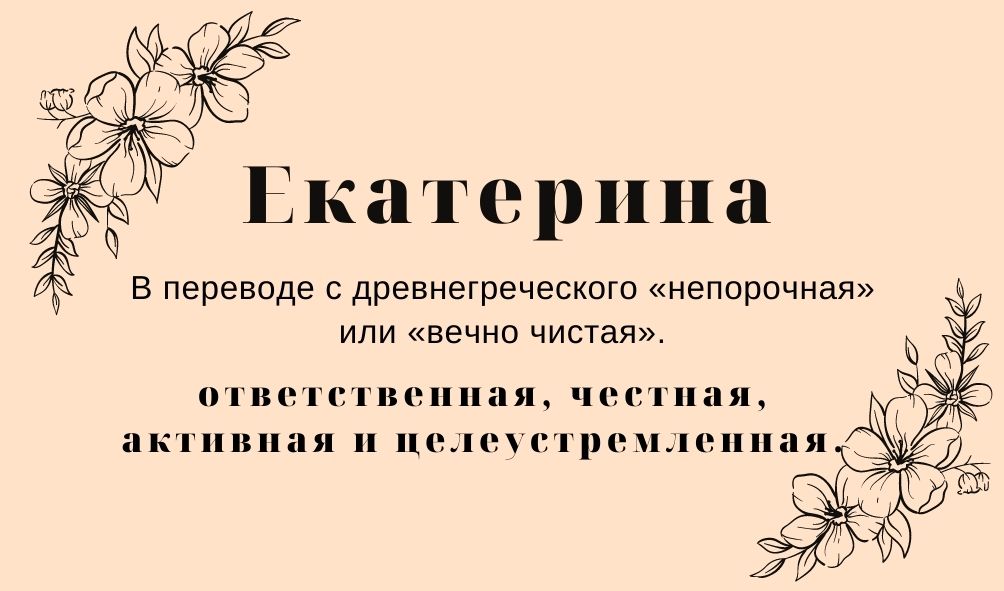 Происхождение имени Екатерина связывают с Древней Грецией, где оно имело значение «непорочной» девушки. Образовалось имя от греческого Экатерини, которое произошло от древнегреческого слова «катарос» и означало «чистая».