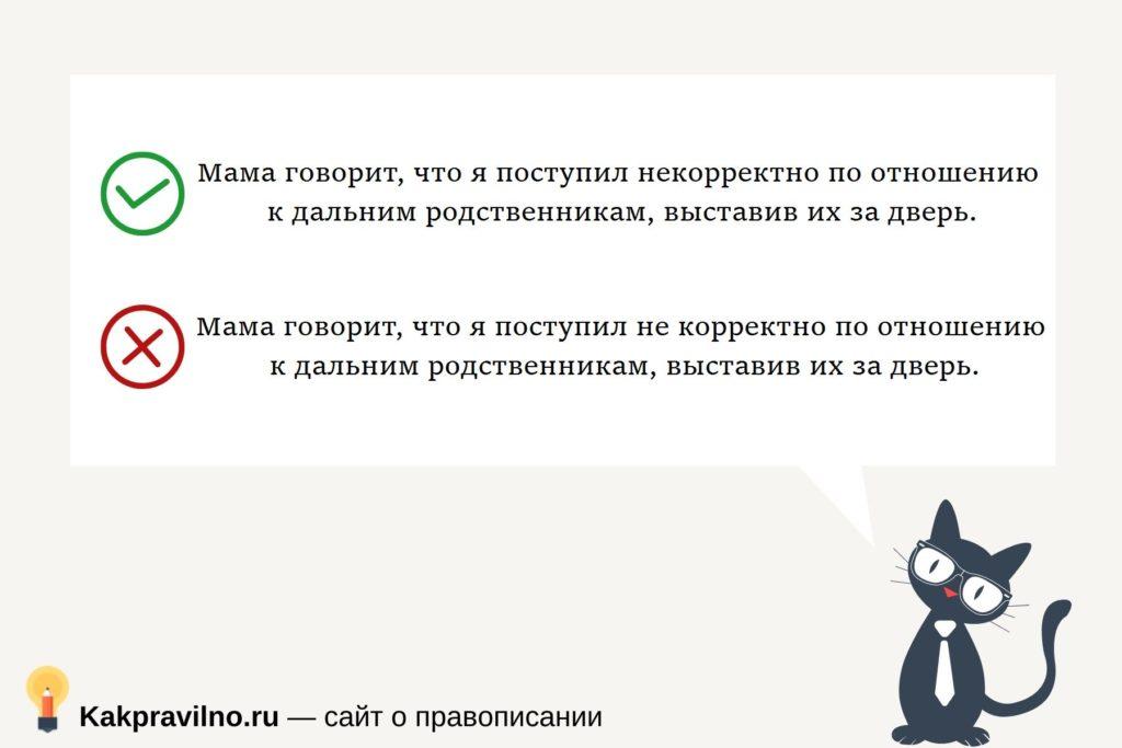 В этих примерах слова «некорректно», принадлежащие к разным частям речи, в зависимости от их значения можно заменить синонимами «ошибочно», «грубо», «бестактно», не имеющими в своем морфемном составе приставки не-.