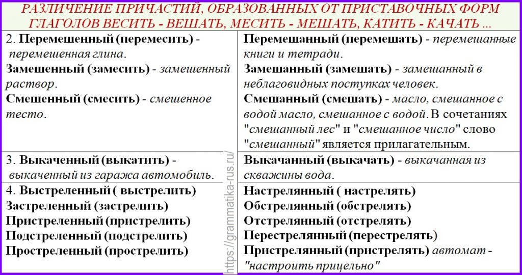 - Перемешенный (перемесить)— перемешенная глина. Перемешанный (перемешать) — перемешанные книги и тетради. Замешенный (замесить) — замешенный раствор. Замешанный (замешать) — замешанный в неблаговидных поступках человек. Смешенный (смесить) — смешенное тесто. Смешанный (смешать) — масло, смешанное с водой. В сочетаниях «смешанный лес» и «смешанное число» слово «смешанный» является прилагательным.