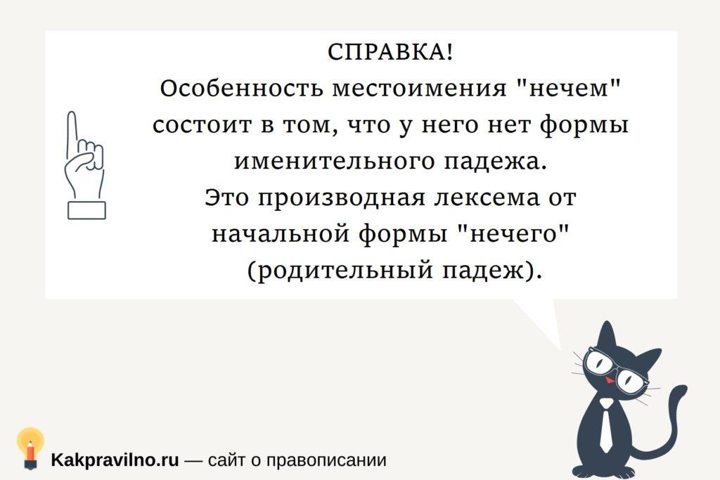 Чтобы развеять сомнения, как пишется нечем в предложении: слитно или раздельно, нужно применить орфографические правила из школьной программы. На первом этапе выясняют, к какой части речи относится слово.
