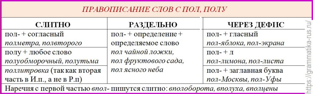 - Если же по соображениям фонетики (внятности и разборчивости речи) присоединить «полу-» к корню на «л» нельзя, то такое слово пишется через дефис: «пол-ладони», «пол-листа», «пол-ложки», «пол-локтя», «пол-люмена» (люмен – системная единица освещённости).