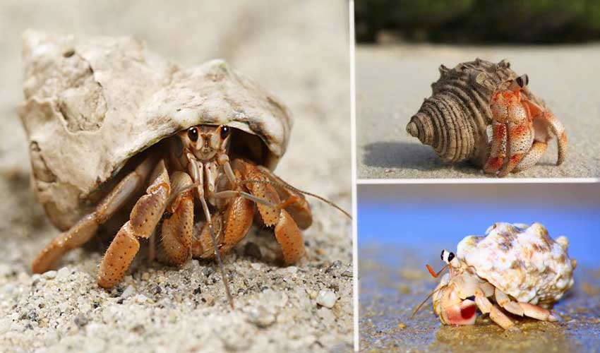 Раки отшельники: сине-полосатый, золотопятнистый, оранжево-полосатый, красноногий.