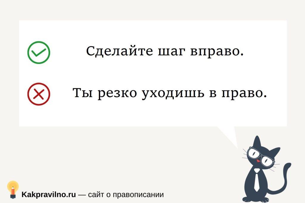 Рассмотрим примеры предложений с наречиями «вправо», «влево», чтобы запомнить их корректное написание: