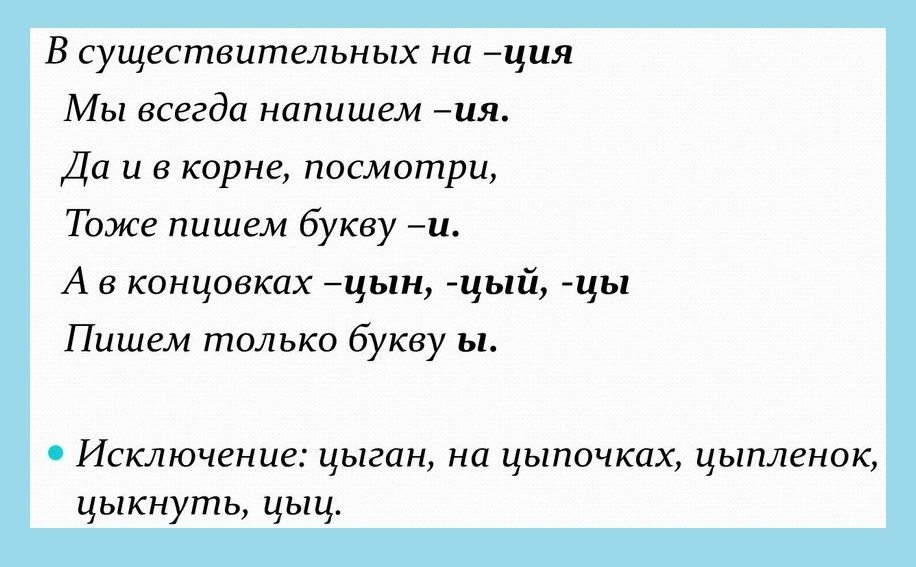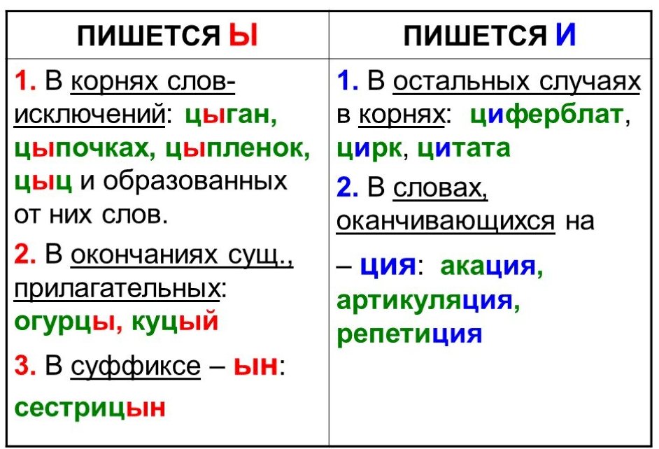 - Следует писать букву Ы после Ц в суффиксах принадлежности -ЫН и окончаниях имен существительных и прилагательных. Примеры: перцЫ, ножницЫ, сестрицЫн, лисицЫн, белолицЫй.