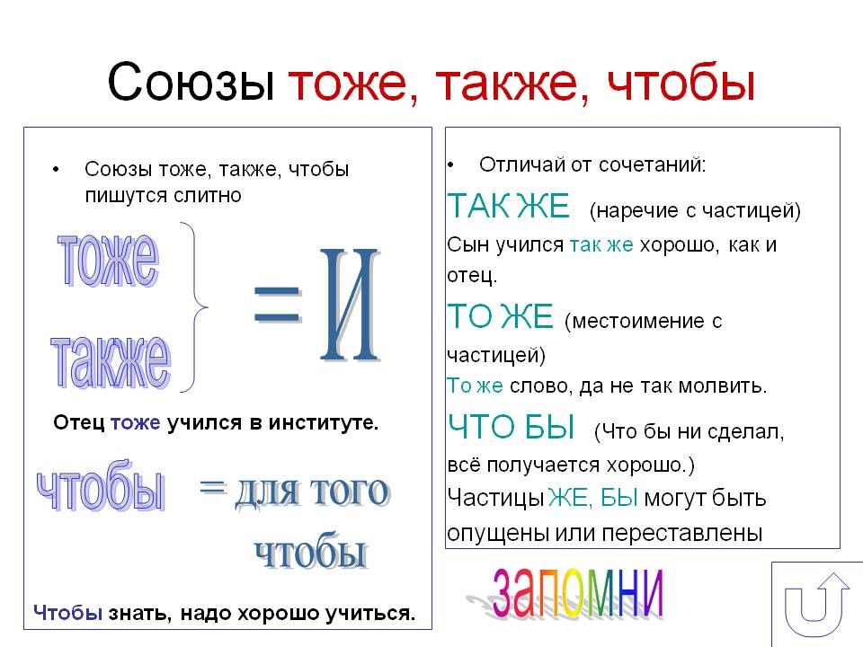 Итак, союз и наречие с частицей можно различить по смысловой нагрузке предложения. У данных слов абсолютно разный смысл и место в предложении. Если вы будете точно знать, какое значение имеет слово, вы навсегда запомните, как пишется «также» или «так же». Давайте разберемся подробнее.