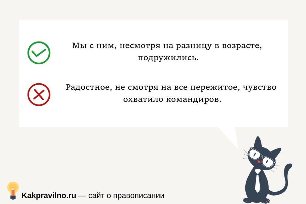 СПРАВКА! Чтобы отличить служебную часть речи и синонимичное сочетание, которое пишется раздельно, используют замену. Если несмотря легко заменяется на подчинительный союз хотя, предлог вопреки, наречие наперекор, лексема выступает в тексте как предлог и слитно пишется.
