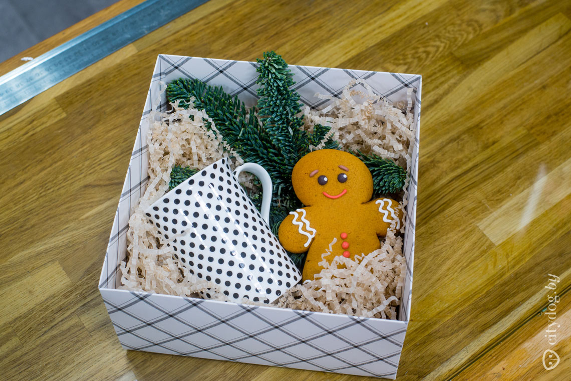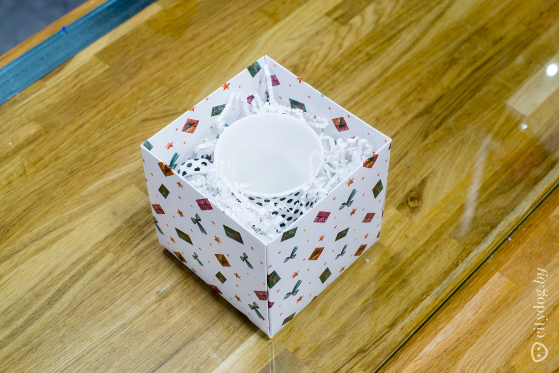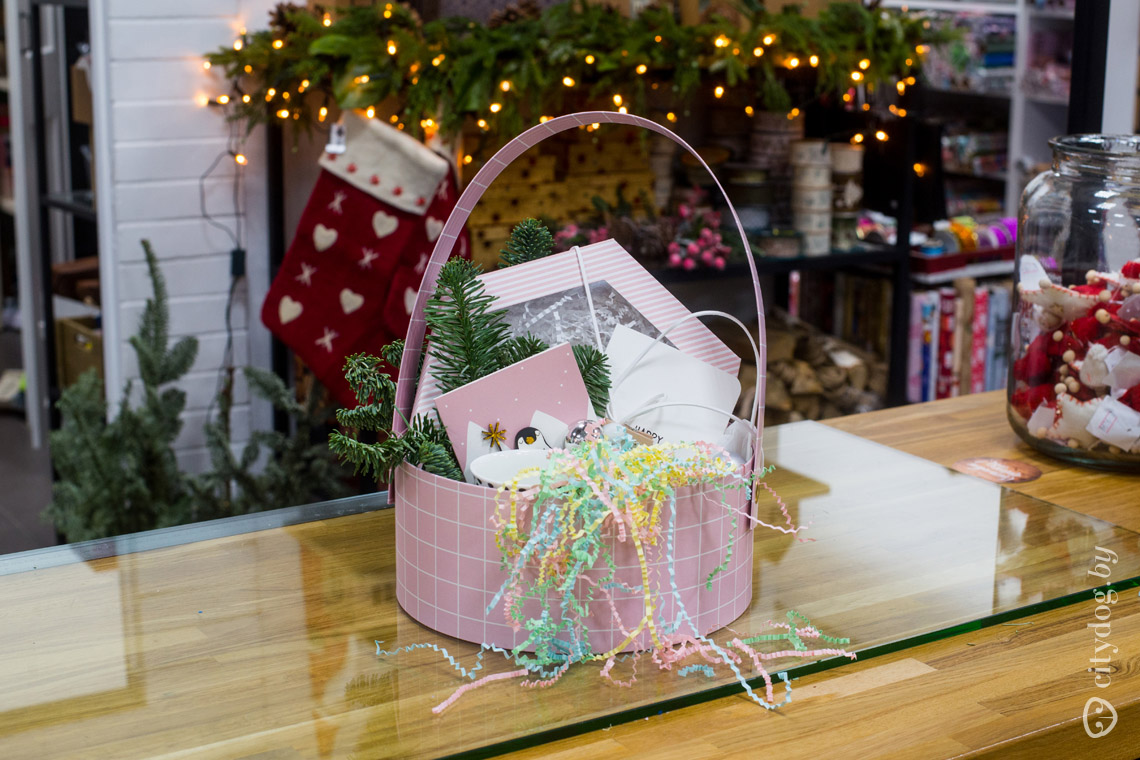 Цвет наполнителя должен быть более приглушенным, чем сама упаковка. К примеру, мы добавляем такой наполнитель – он вроде как веселый, но в нем много лишнего. В таком случае с подарка нужно убрать открытку и добавить желтого – поставить желтые коробки, к примеру.