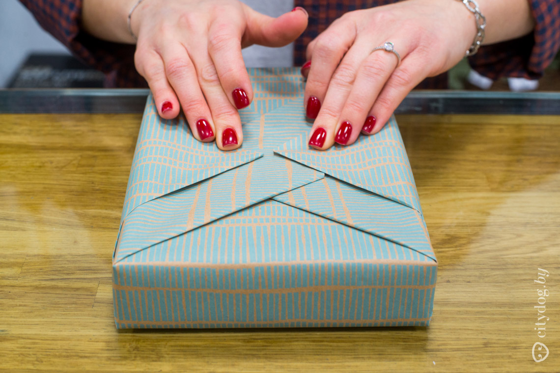 Натягиваем лист бумаги и закрываем подарок частью со скотчем. Склеиваем ее с нижней частью листа. Разглаживаем бумагу по бокам. Осталось закрыть края. Подгибаем верхнюю и нижнюю часть, чтобы образовались такие уголки, и скрепляем их с помощью двустороннего скотча.