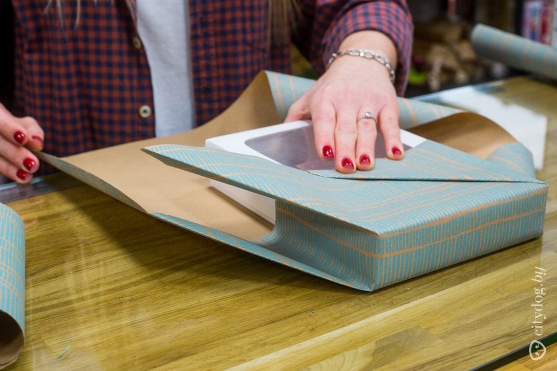 Количество нужной бумаги отмеряем по самому подарку. Прикладываем его к краю бумаги и отступаем настолько, чтобы бумага закрывала ребро больше, чем наполовину. Четвертая сторона листа должна закрывать подарок полностью.