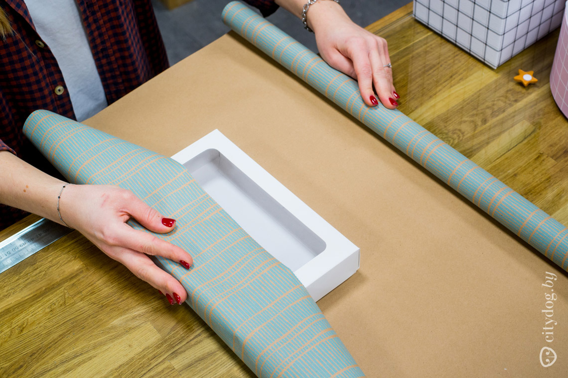 Отрезаем бумагу так, чтобы лист закрывал подарок с каждой стороны наполовину. Если немного ошиблись с размерами и бумаги слегка не хватает, прорези можно прикрыть лентами.