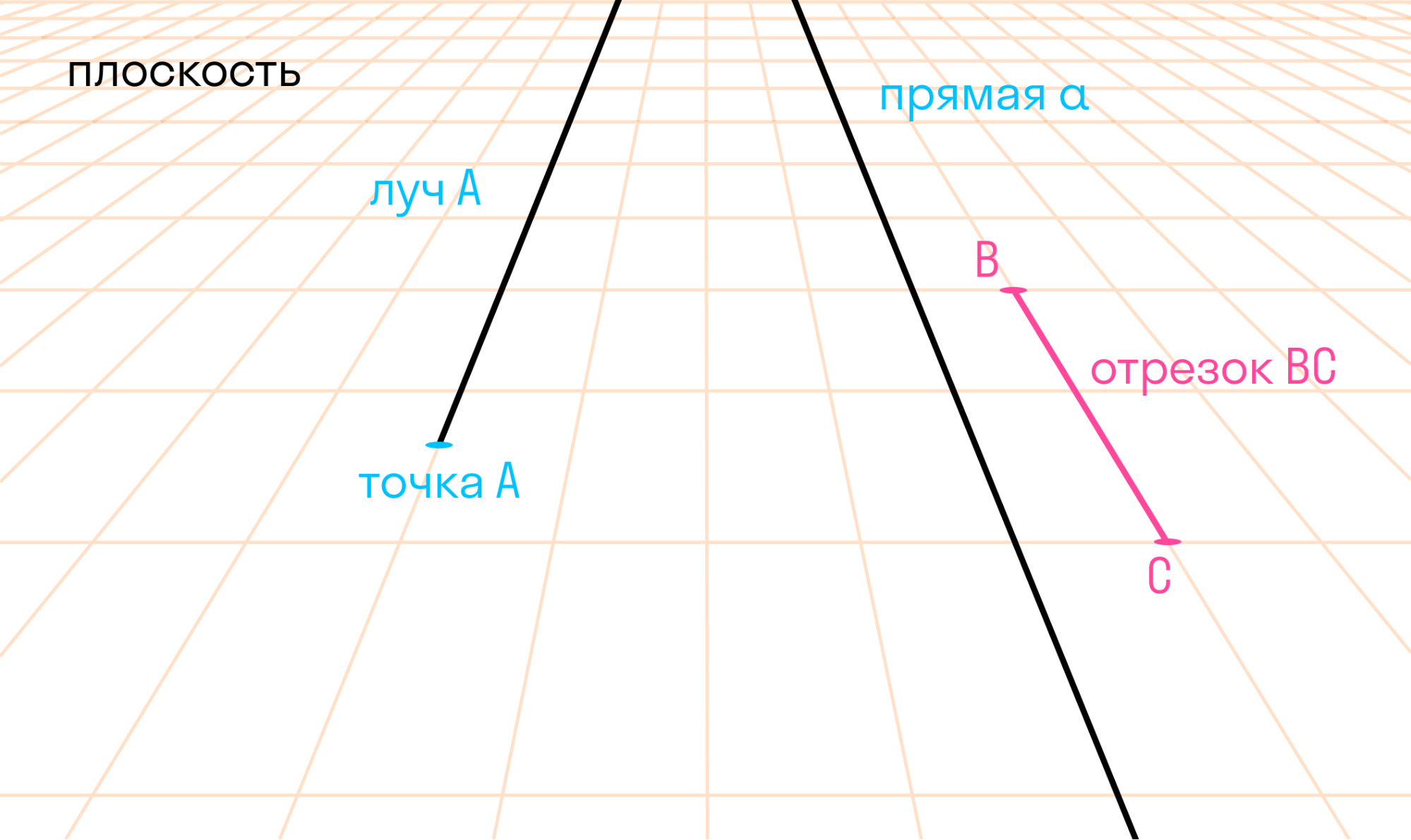 Базовые геометрические фигуры — это точки, отрезки, лучи, прямые, плоскости.
