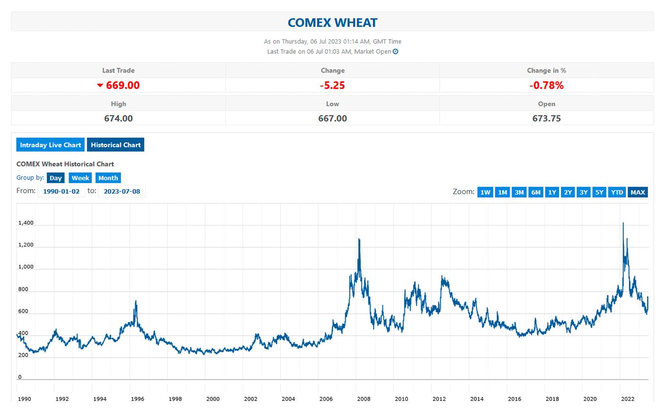 Цена на пшеницу, как и цена на нефть, долгое время снижалась после максимума 2008 года (около 13 долларов за бушель). С 2018 года стоимость товара перешла к росту, а в марте 2022-го произошел всплеск цены до нового максимума — более 14 долларов за бушель.