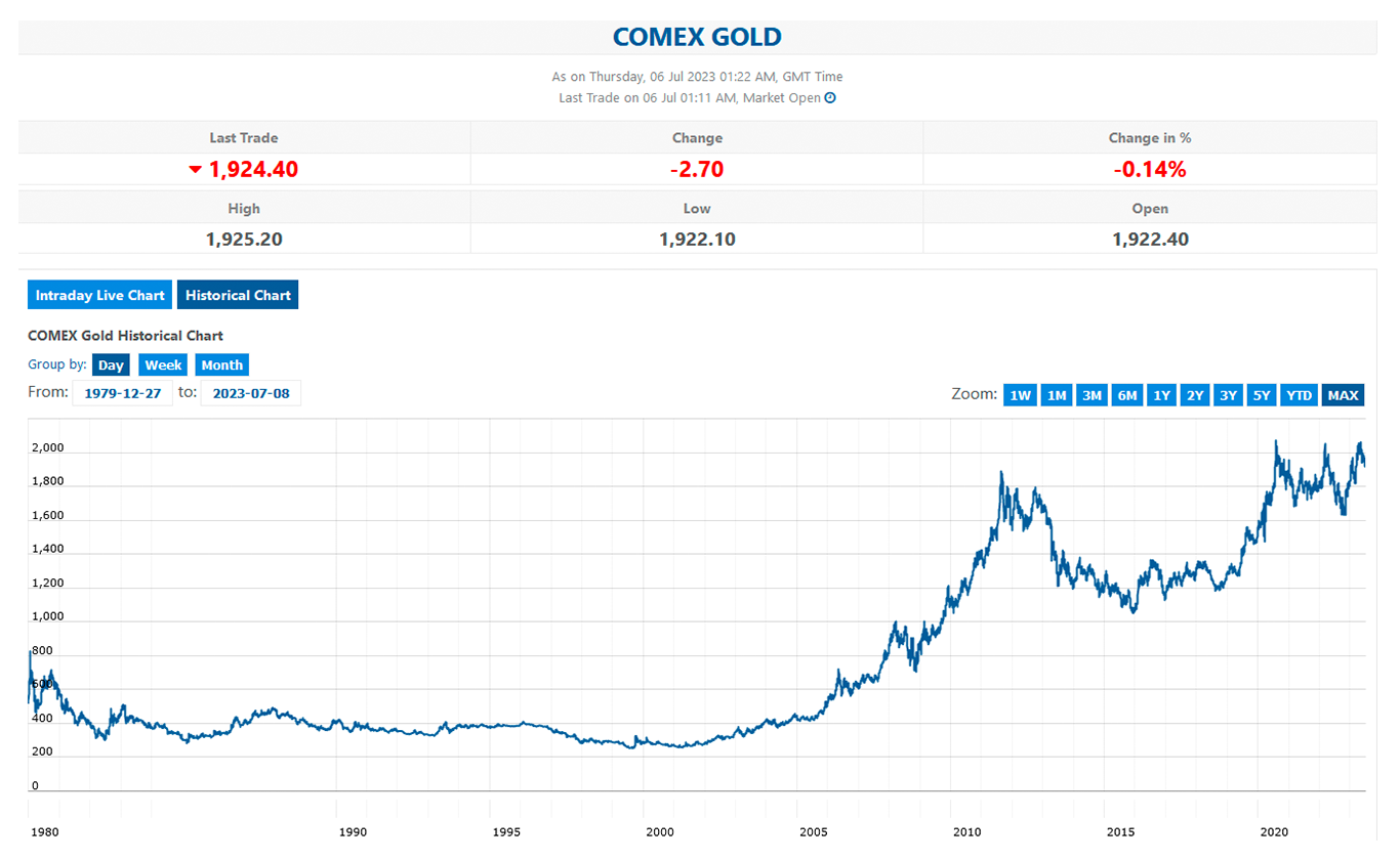 Цена на золото начала падать позднее, чем цена на нефть. Она достигла максимума в 2011 году на уровне около 1 900 долларов за тройскую унцию. Новый рост начался уже в 2018 году, а в 2020 году был установлен новый ценовой рекорд — более 2 000 долларов за унцию. В 2022–2023 годах стоимость золота приближалась к этой пиковой отметке.