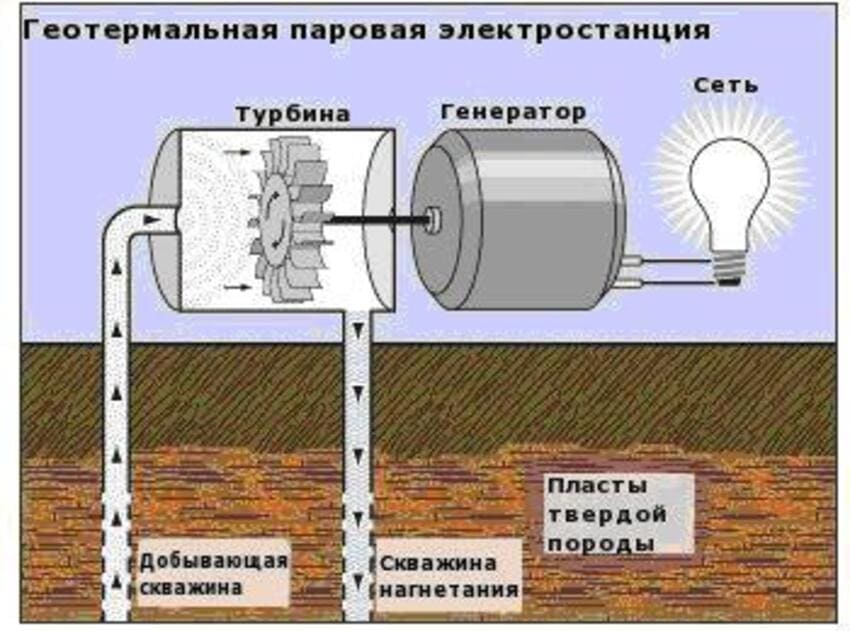 Геотермальная энергия — это использует тепло, которое происходит внутри земли, для создания пара и производства электричества. Геотермальные установки строятся на грунтовых скважинах, где горячая вода и пар поднимаются на поверхность и используются для привода турбин. После этого пар и вода возвращаются в грунт, чтобы снова усваивать тепло.
