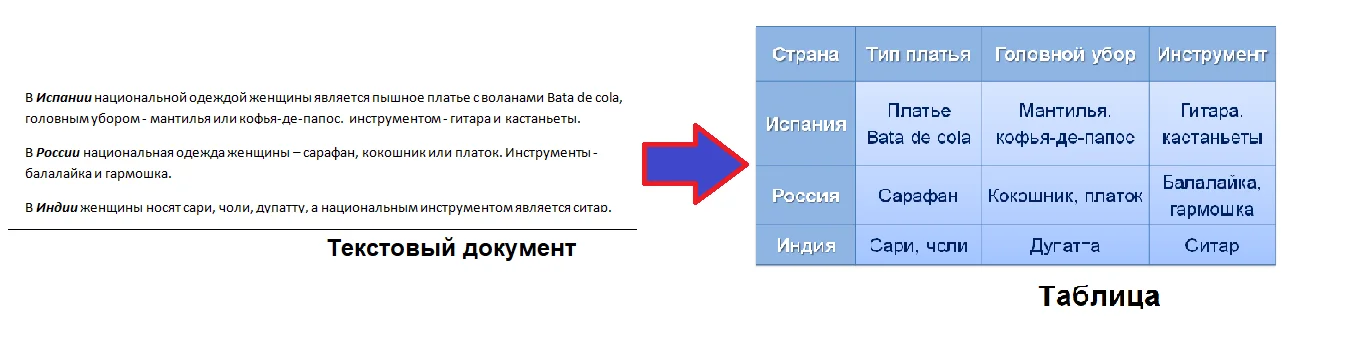 1. Преобразуйте текстовую информацию в табличную. Дайте названия столбцам и заполните таблицу.