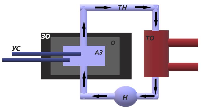 Рисунок 4 – Схема устройства ядерного реактора (АЗ – активная зона, О – отражатель, ЗО – защитная оболочка, УС – управляющие стержни, ТН – теплоноситель, Н – насос, ТО – теплообменник)