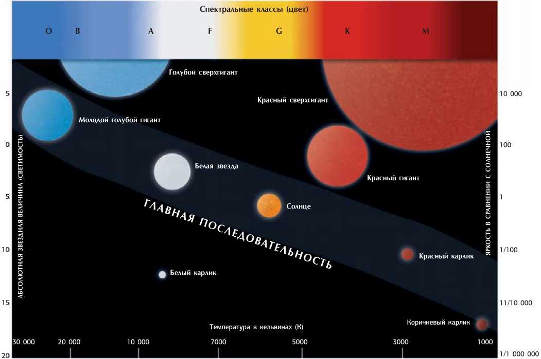 На диаграмме Герцшпрунга Рассела (вверху) показана связь между температурой звезды и ее светимостью. Температура звезд при движении слева направо падает; при перемещении сверху вниз ослабевает яркость излучения. Наше Солнце — типичная звезда в центре главной последовательности.