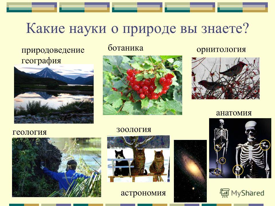 2 Какие науки о природе вы знаете? ботаника астрономия анатомия зоология орнитология география природоведение геология