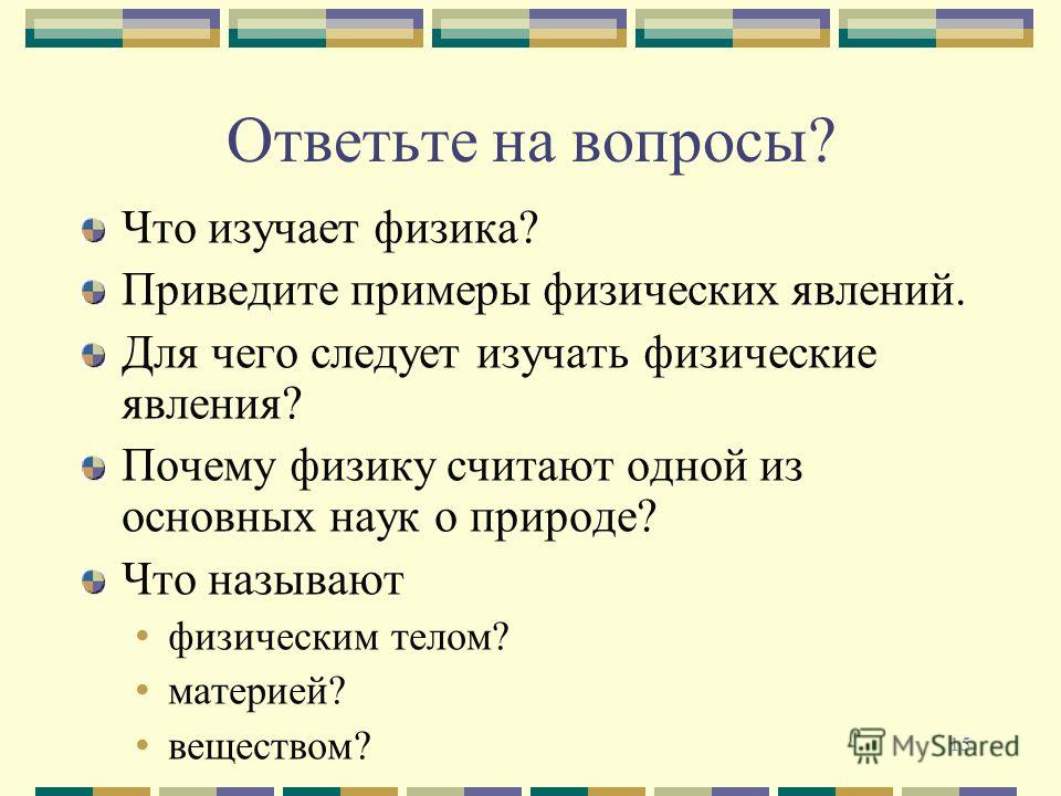 15 Ответьте на вопросы? Что изучает физика? Приведите примеры физических явлений. Для чего следует изучать физические явления? Почему физику считают одной из основных наук о природе? Что называют физическим телом? материей? веществом?
