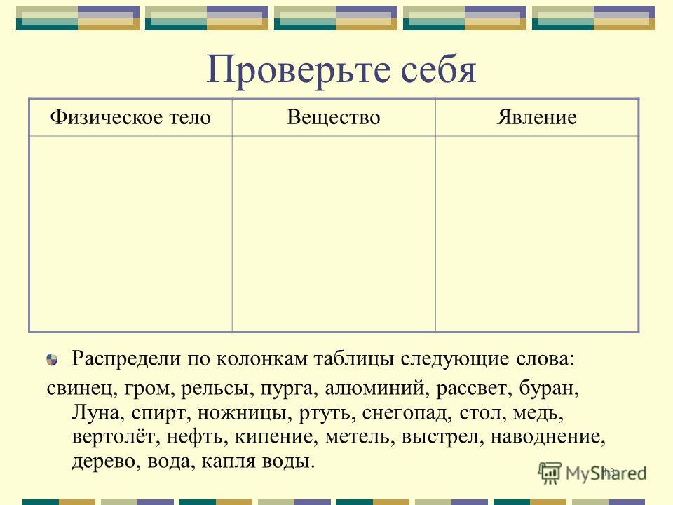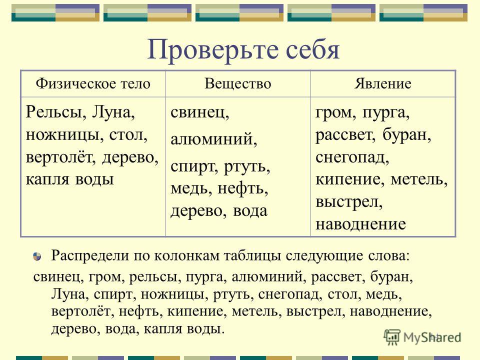 13 Проверьте себя Распредели по колонкам таблицы следующие слова: свинец, гром, рельсы, пурга, алюминий, рассвет, буран, Луна, спирт, ножницы, ртуть, снегопад, стол, медь, вертолёт, нефть, кипение, метель, выстрел, наводнение, дерево, вода, капля воды. Физическое телоВеществоЯвление