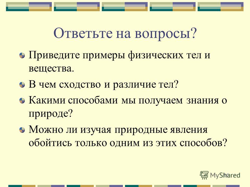 16 Ответьте на вопросы? Приведите примеры физических тел и вещества. В чем сходство и различие тел? Какими способами мы получаем знания о природе? Можно ли изучая природные явления обойтись только одним из этих способов?
