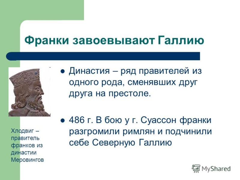 Франки завоевывают Галлию Династия – ряд правителей из одного рода, сменявших друг друга на престоле. 486 г. В бою у г. Суассон франки разгромили римлян и подчинили себе Северную Галлию Хлодвиг – правитель франков из династии Меровингов