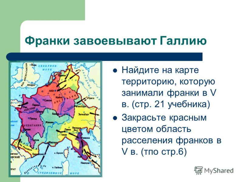 Франки завоевывают Галлию Найдите на карте территорию, которую занимали франки в V в. (стр. 21 учебника) Закрасьте красным цветом область расселения франков в V в. (тпо стр.6)
