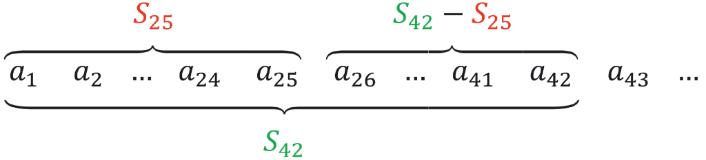 Чтобы вычислить сумму первых двадцати пяти элементов, нам нужно знать значение первого и двадцать пятого члена. |