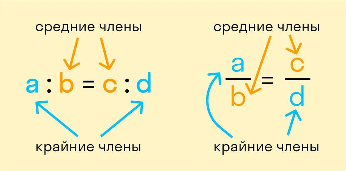a:b = c:d, где a, b, c, d — это различные величины, которые участвуют в пропорции.
