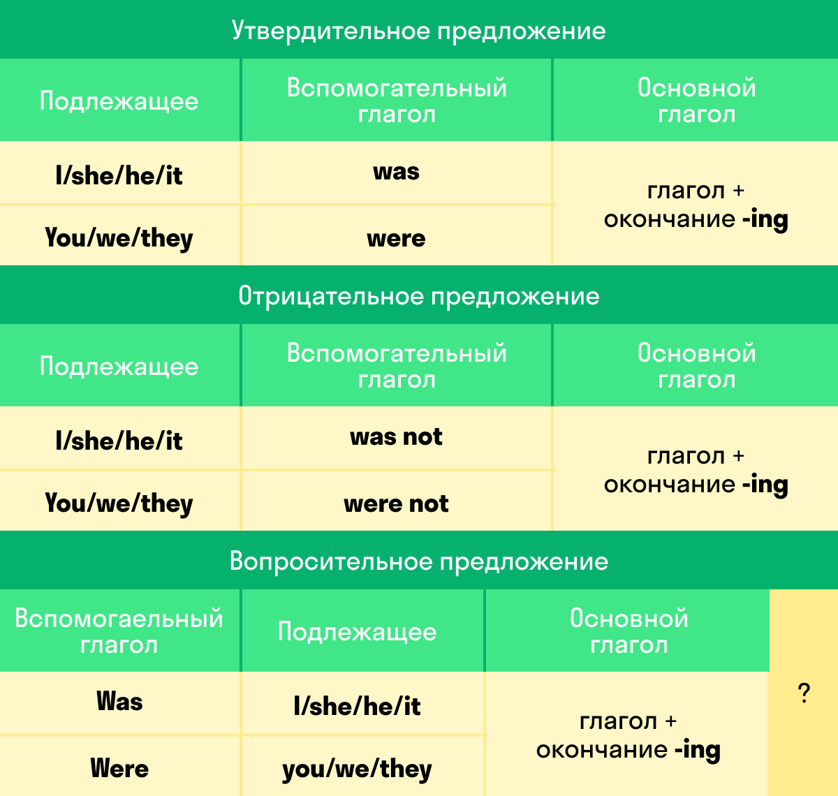 В Past Continuous самую большую сложность представляет написание окончания -ing у глаголов и изменение с различными местоимениями формы глагола ‘to be’.