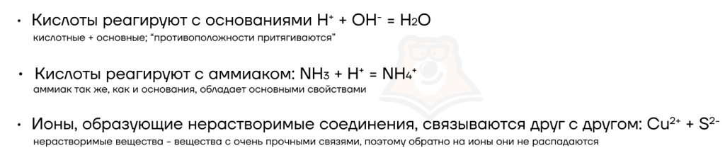 В химии существует ряд условий, при наличии которых реакция считается необратимой. Они отражены в таблице: