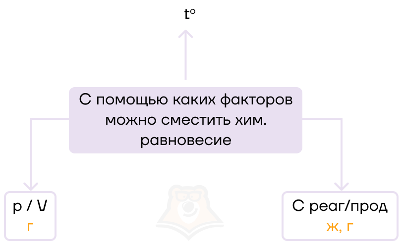 В случае обратимых реакций под воздействием внешних факторов (изменение концентрации веществ, температуры, давления) соотношение скоростей прямой и обратной реакций могут изменяться. Если скорость прямой реакции выше, чем обратной, в реакционной системе преобладают продукты реакции. В этом случае говорят, что равновесие смещено в сторону прямой реакции (вправо). Если скорость обратной реакции выше, и в системе преобладают исходные вещества, говорят, что равновесие смещено в сторону обратной реакции (влево). Факторы, влияющие на положение равновесия, перечислены в таблице.