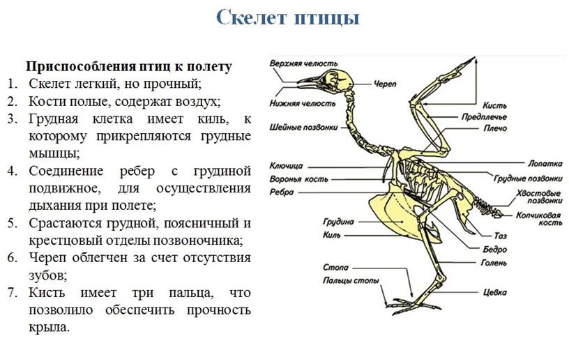 В общем строении скелета птиц можно выявить схожие черты с пресмыкающимися. Наблюдаются одинаковые отделы в скелете: череп, позвоночник, скелет конечностей. Передняя конечность птиц представляет собой крыло, в связи с этим строение отличается от пятипалой конечности других позвоночных животных. Особенности строения внутреннего скелета птиц представлены на рисунке.