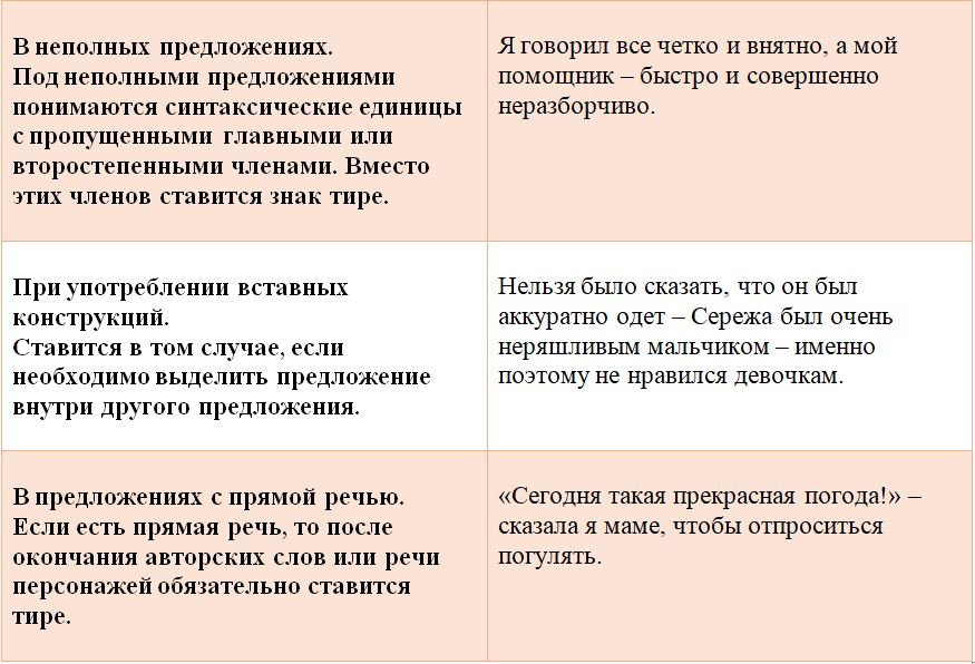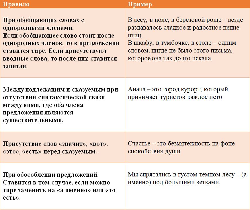 Рассмотрим более подробно таблицу с примерами о расстановке тире в синтаксических конструкциях: