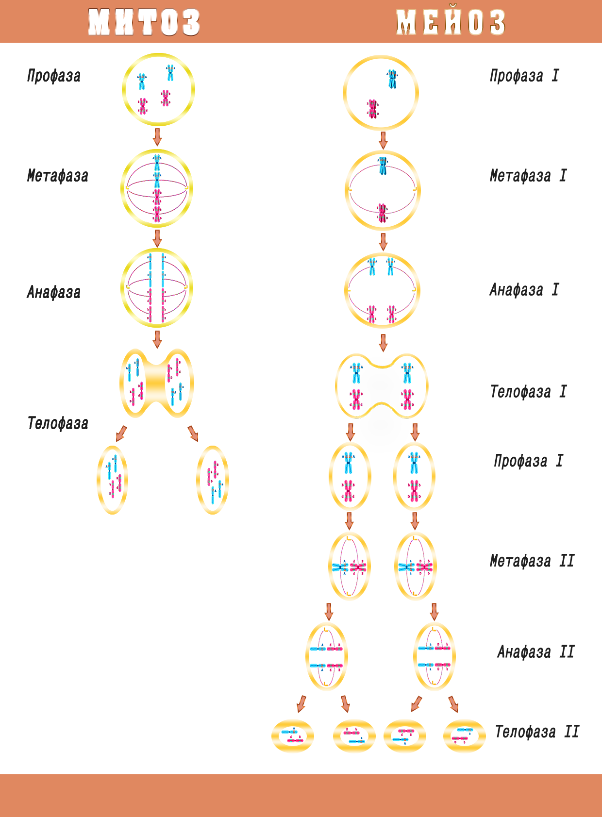 Мейоз представляет собой непрерывный процесс, состоящий из двух последовательных делений, называемых мейозом I и мейозом II. В каждом делении различают профазу, метафазу, анафазу и телофазу. В результате мейоза I число хромосом уменьшается вдвое (редукционное деление): при мейозе II гаплоидность клеток сохраняется (эквационное деление).