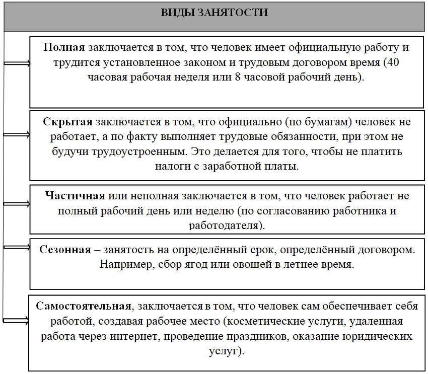 Помимо видов занятости, при изучении этого понятия рассматривают и формы занятости: