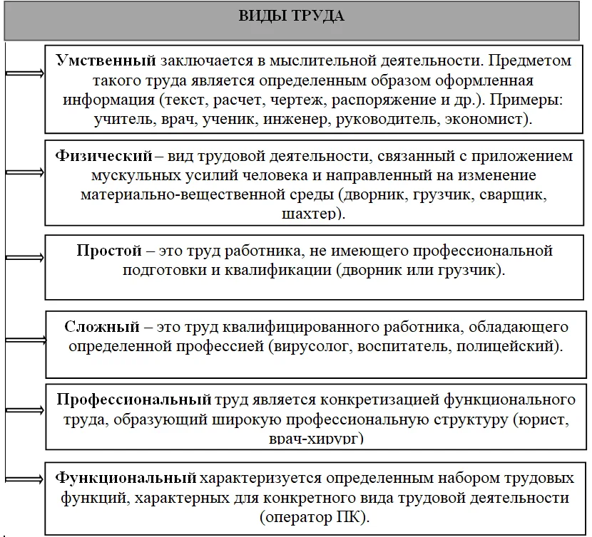 Прежде всего, дадим определение понятию труд. Это деятельность, которую осуществляют люди для того, чтобы создавать товары или услуги, используя для этого свои способности, знания, время и силы. Примеры труда: токарь, слесарь, пекарь, учитель, врач, бухгалтер и т.д. Из примеров понятно, что существует несколько разновидностей труда: