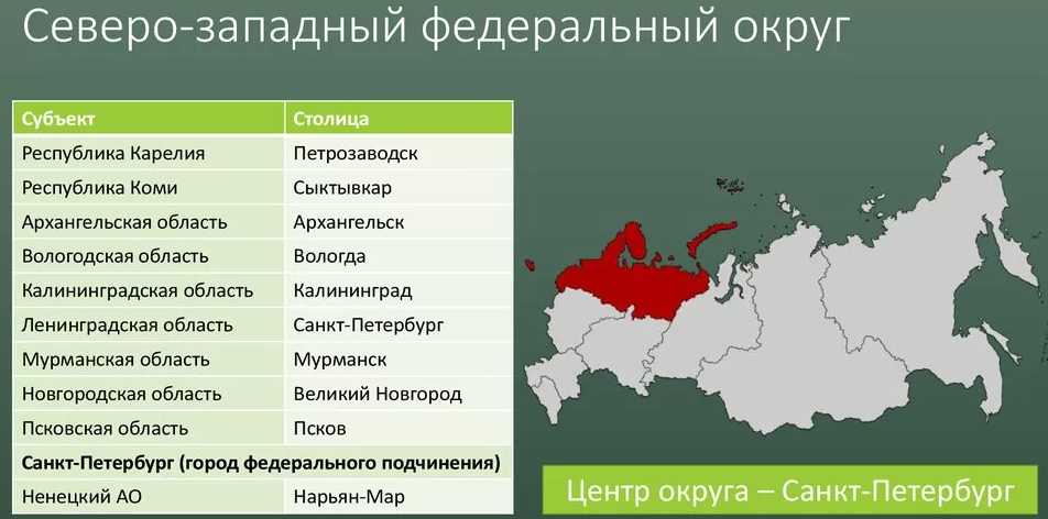 В Северо-Западный федеральный округ входят Республика Коми, Республика Карелия, Вологодская, Архангельская, Ленинградская, Новгородская, Мурманская, Псковская, Калининградская, Ненецкий автономный округ и город Санкт-Петербург (рис. 1).