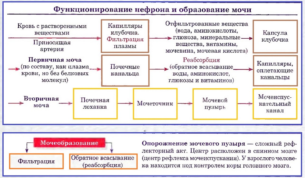 Образование мочи идет в два этапа: фильтрация и реабсорбция.