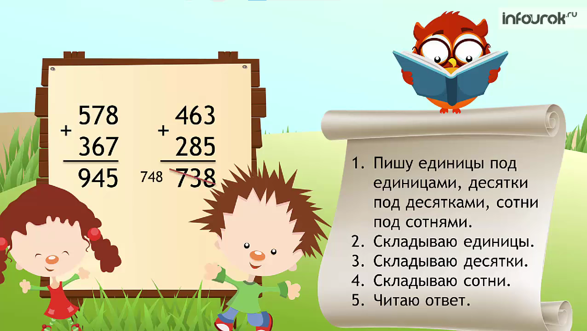 А теперь решите самостоятельно пример на вычитание. 964 — 542 Объясните приём вычисления. Мудрая Сова согласна с вами. Проверьте решение. Пишу единицы под единицами, десятки под десятками, сотни под сотнями. Вычитаю единицы: 4 ед. — 2 ед. = 2 ед. Вычитаю десятки: 6 дес. — 4 дес. = 2 дес. Вычитаю сотни: 9 сот. — 5 сот = 4. Читаю ответ: 422. |