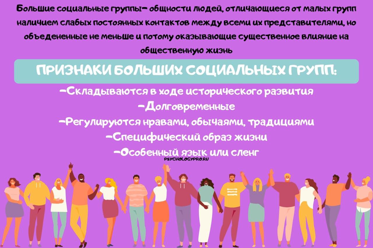 Большие – группы, в которых люди чаще всего не только не знают друг друга, но и не имеют непосредственных контактов (социальные классы, слои, этносы, профессиональные группы). Большие группы нередко называют общностями (этническая общность, профессиональная общность).
