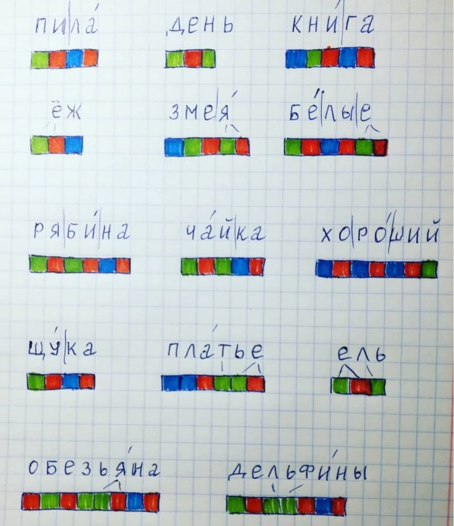 В 1 классе дети делают звуко-буквенный разбор, закрашивая в красный, зеленый и синий цвета ячейки, обозначающие звуки. Таким образом в 1 классе составляются звуковые модели или звуковые схемы слов.