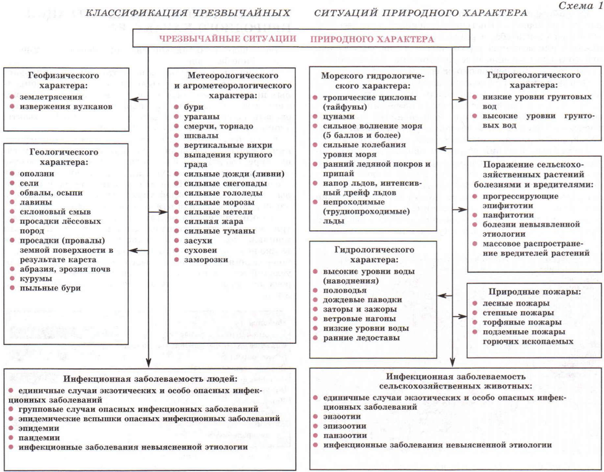 Такие явления могут иметь различное происхождение, что и стало основой классификации чрезвычайных ситуаций природного характера, приведенной на схеме 1.
