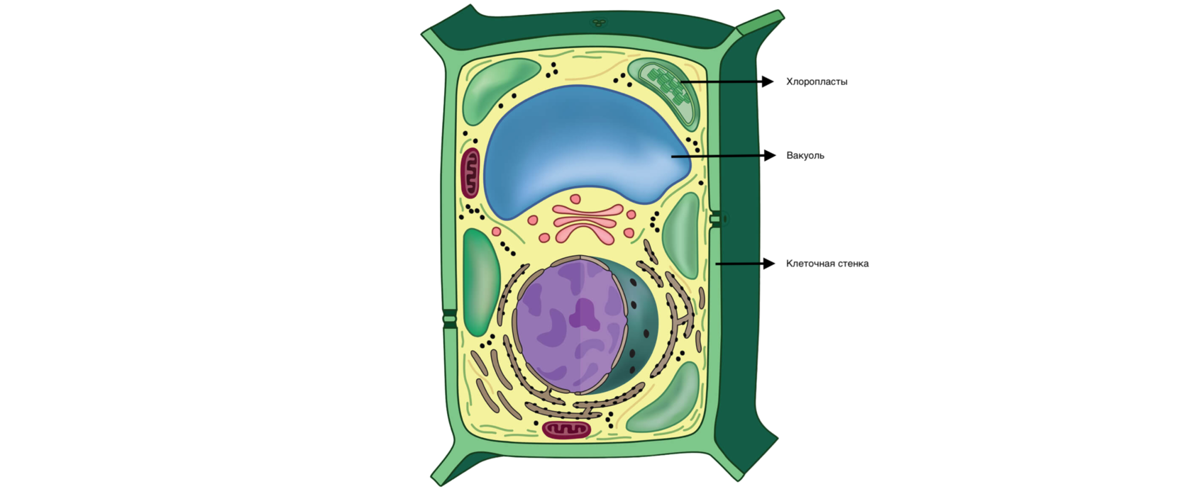 - Крупная центральная вакуоль (содержит большое количество клеточного сока, поддерживает тургор, может оттеснять ядро на периферию)