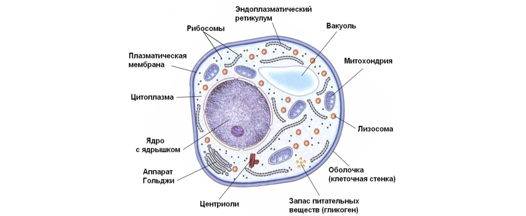 Несмотря на все разнообразие клеток, общий план строения для них един: все они содержат наследственную информацию, погруженную в цитоплазму, и окружающую клетку плазматическую мембрану. Снаружи от мембраны у клетки может быть еще клеточная стенка, состоящая из различных веществ, которая служит для защиты клетки и является своего рода ее внешним скелетом.