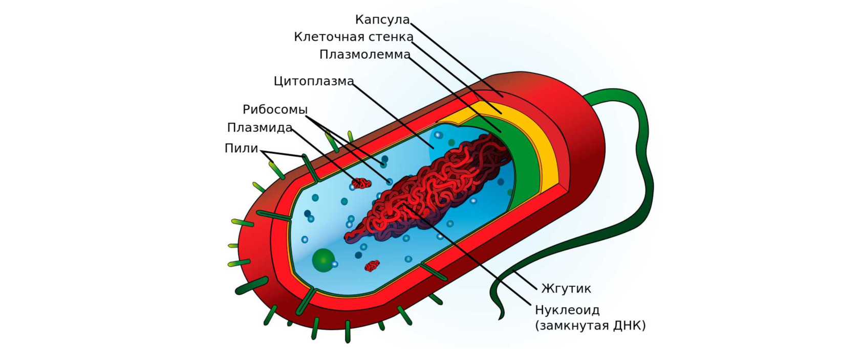 - Пили — волоскоподобные структуры на поверхности клетки, которые прикрепляются к другим бактериальным клеткам