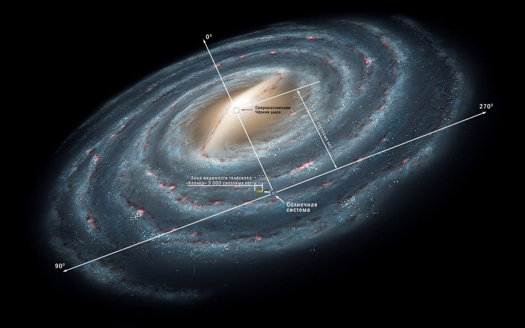Расстояние от Солнца до центра Галактики составляет 23-28 тыс. световых лет, или 7–9 тыс. парсек. Это говорит о том, что Солнце расположено ближе к окраине диска, чем к его центру.