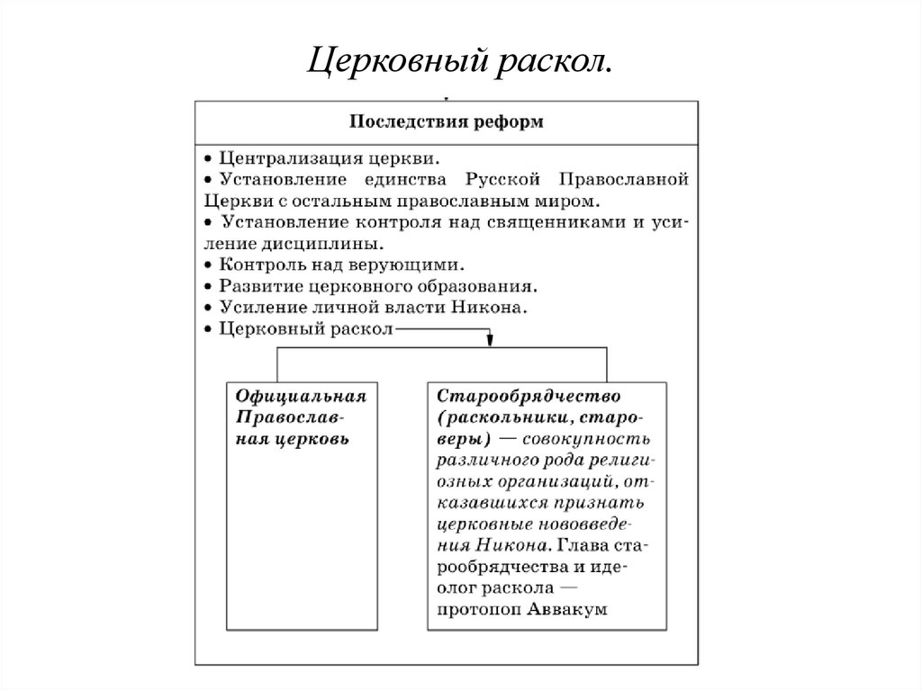 Нами был подробно изучен церковный раскол, а именно причины и последствия. Данные своего исследования мы также представили в виде таблицы.