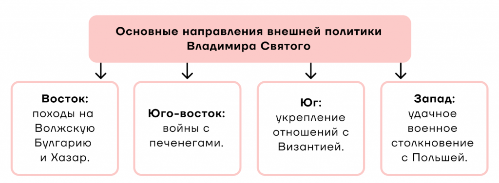 Главной целью Владимира было расширение государства. Рассмотрим схему, в которой приведены все основные направления внешней политики Владимира: